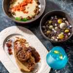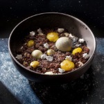 1. «Точка старта» Блюдо символизирует Землю как отправную точку космического путешествия. В основе — тартар из северной форели (как континент) на креме из печёного картофеля (образ земных недр). 2. «Орбита» Блюдо посвящено жизни космонавта на орбите и отсылает к еде из тюбиков. Центральным элементом выступает томлёная говядина (ядро космической станции) 3. «Первый шаг» Десерт вдохновлён первым выходом человека на Луну и осознанием масштаба Вселенной. Визуально воссоздаёт лунную поверхность